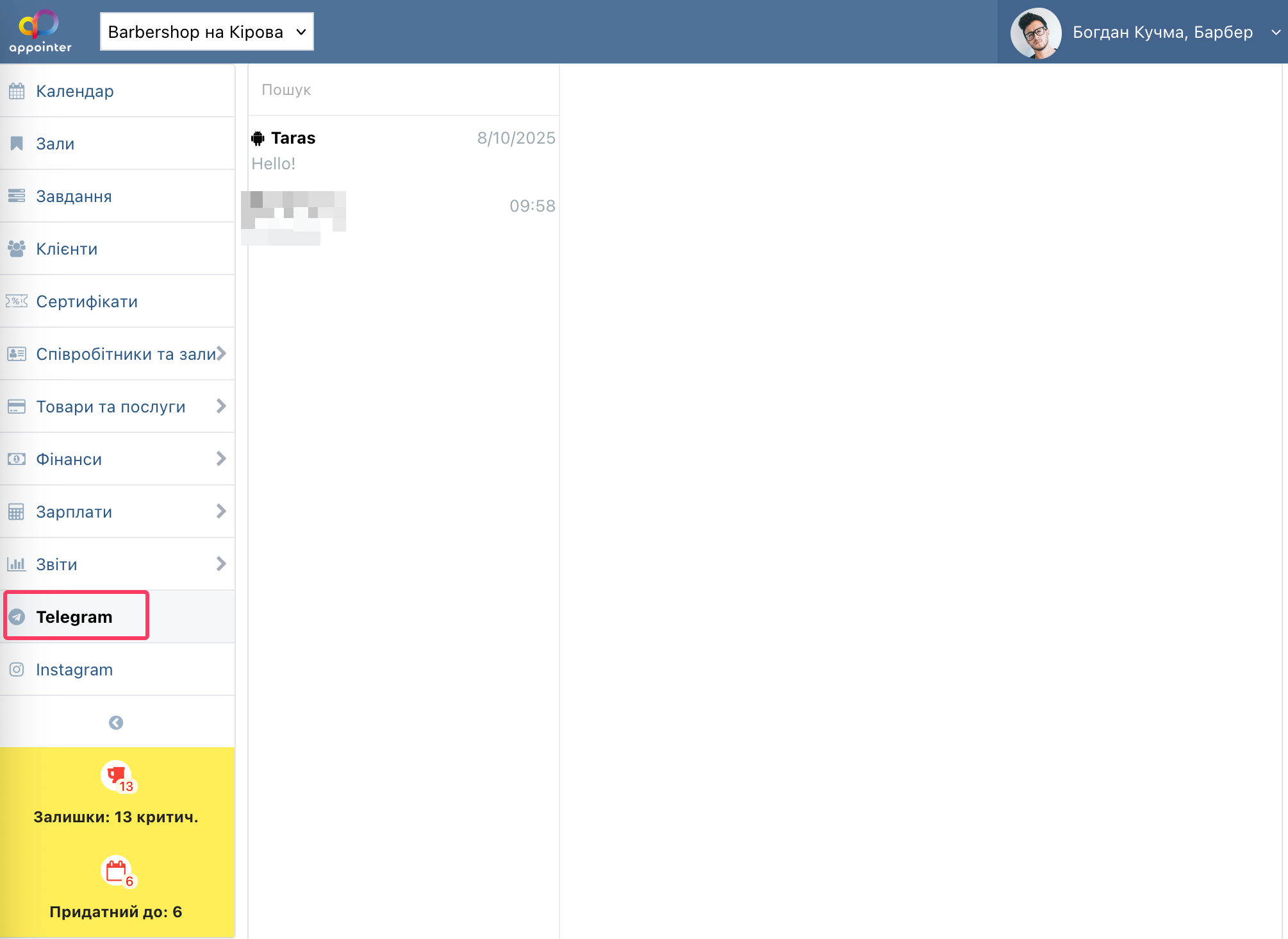 Ви можете перейти в меню «Telegram» і продовжити листування з вашими клієнтами: