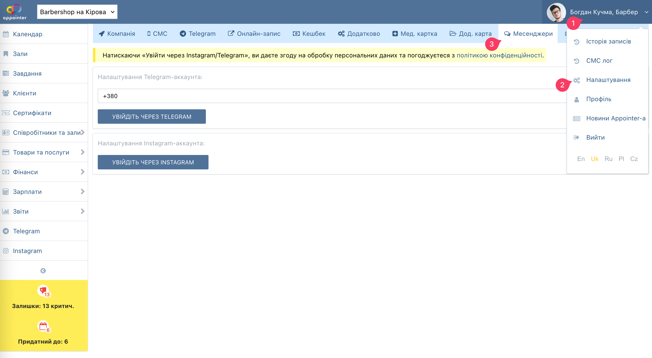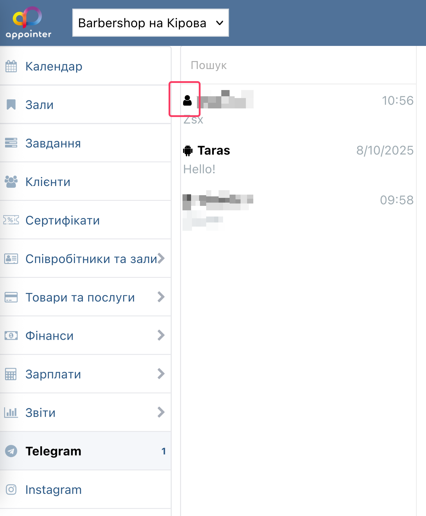 Для листування з вашими клієнтами через Телеграм-месенджер, Аппоінтер пропонує 2 канали комунікації.