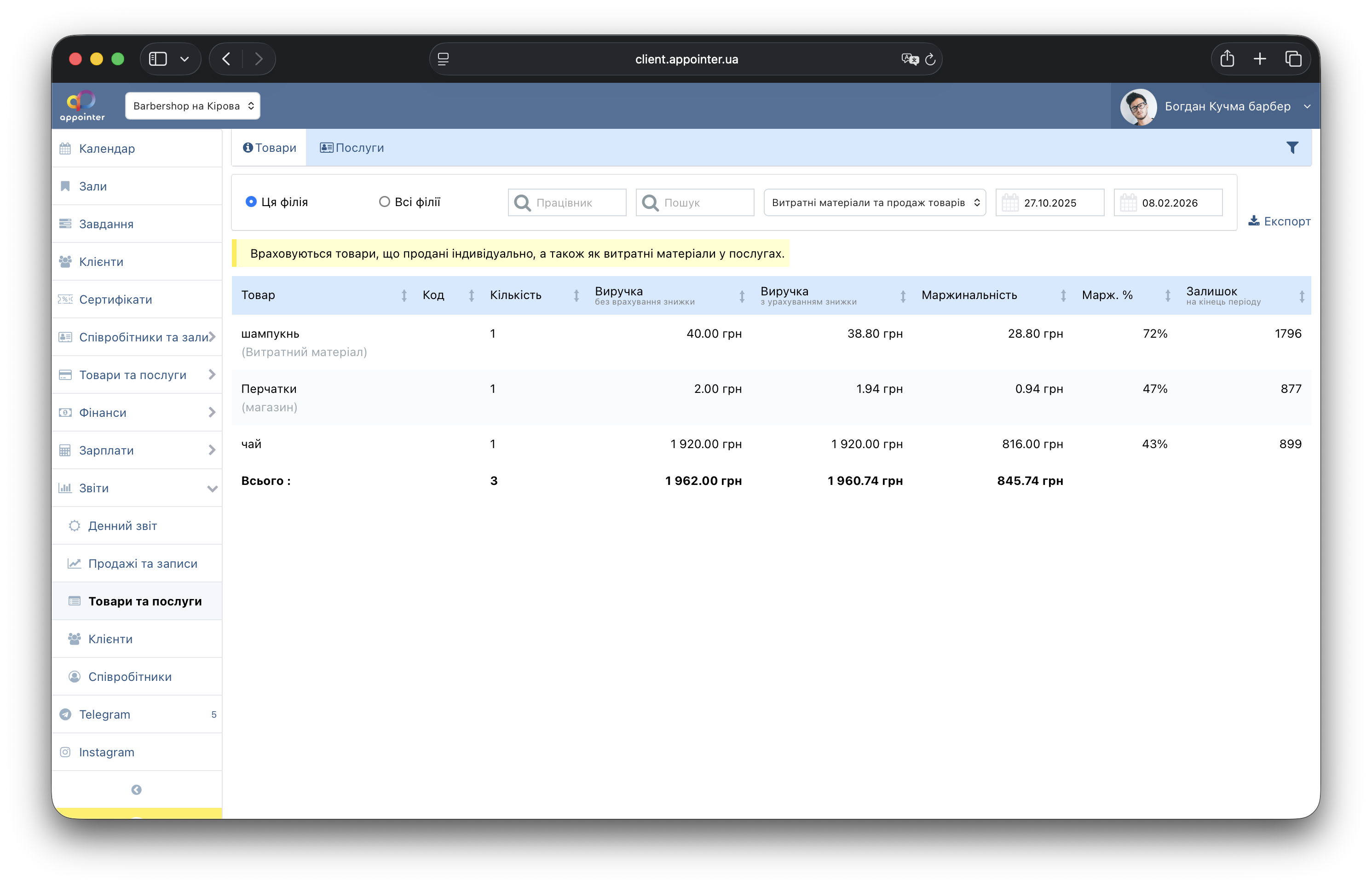 Ця функція дозволяє продавати товари без необхідності створювати запис на прийом в календарі. Функція продажу товару доступна в меню Товари / Послуги: